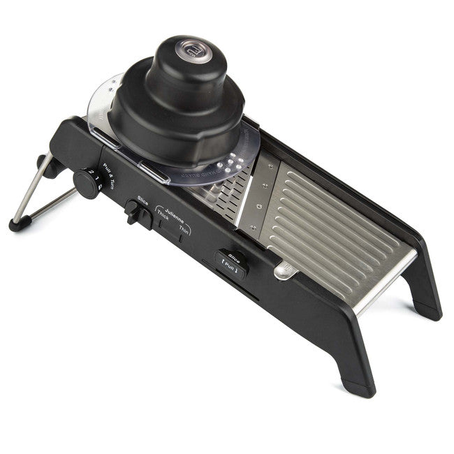 Create restaurant-approved dishes at home effortlessly with the PL8 Professional Mandoline 2.0. This is the upgraded version of our original PL8 Professional Mandoline and includes an all-new spring-loaded handguard that provides consistent pressure for the slicing, julienne, and waffle cuts, and integrated blades that adjust to 4 slicing thicknesses of 1mm, 3.5mm, 5.5mm, and 7.5mm.